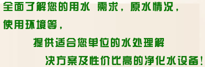 | 主營產(chǎn)品: · 反滲透純凈水設(shè)備(去離子水) · 超濾過濾系統(tǒng)(桶裝水) · 軟化水設(shè)備 · 超純水設(shè)備 · 一體化/污水處理設(shè)備 · 水處理設(shè)備配件及耗材 |